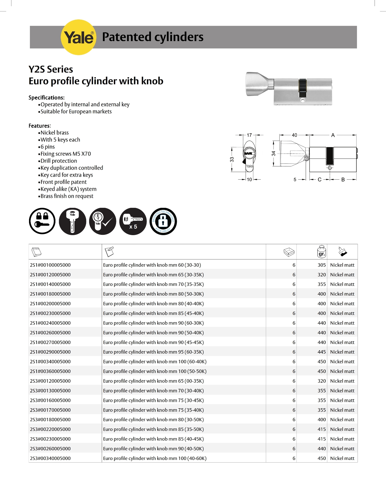 Yale Y2S Series Euro Profile Cylinder with Knob