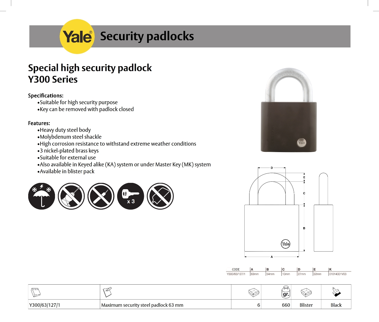 Yale Special High Security Padlock Y300 Series