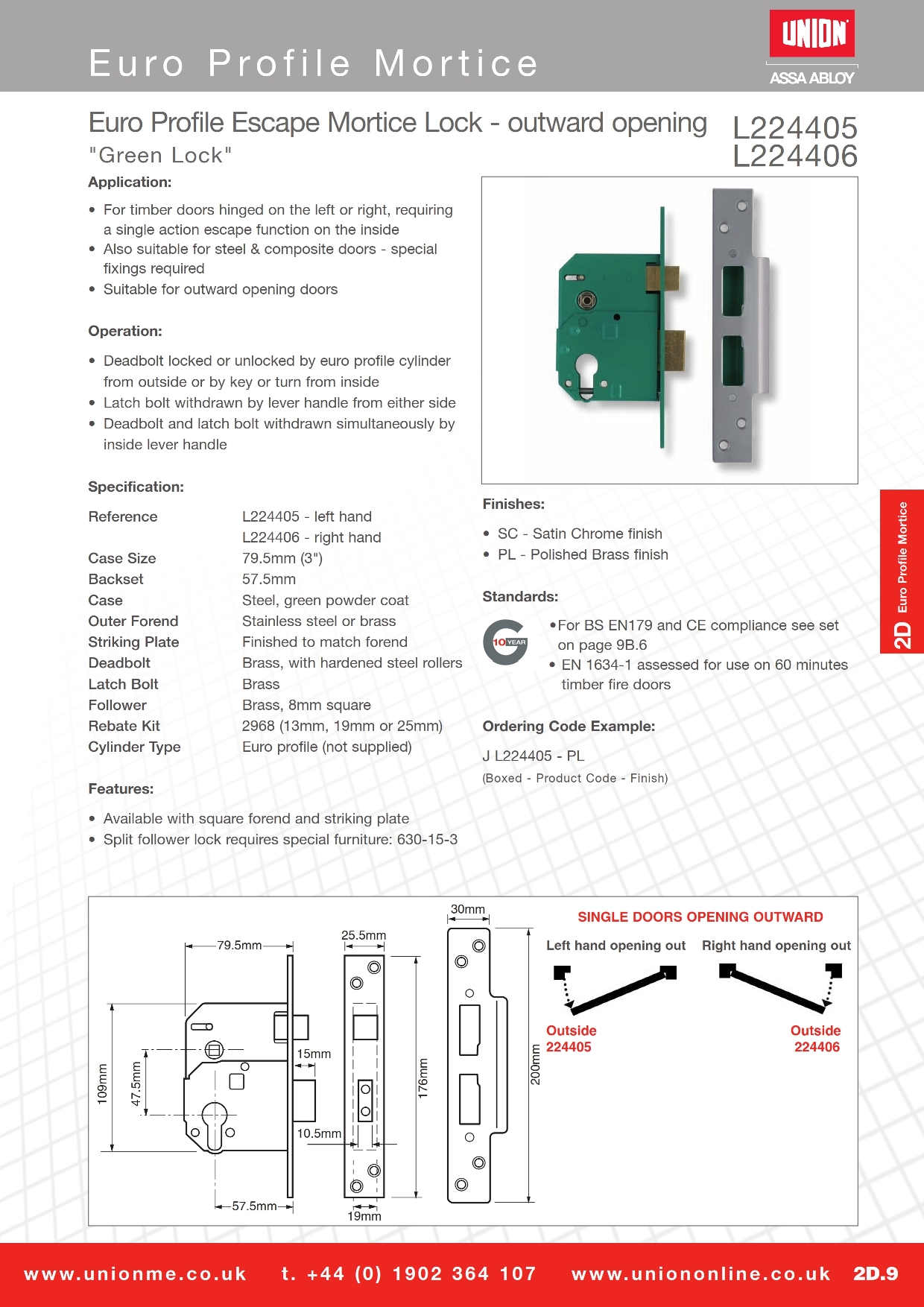 UNION Euro Profile Escape Mortice Lock outward opening L224405/L220406