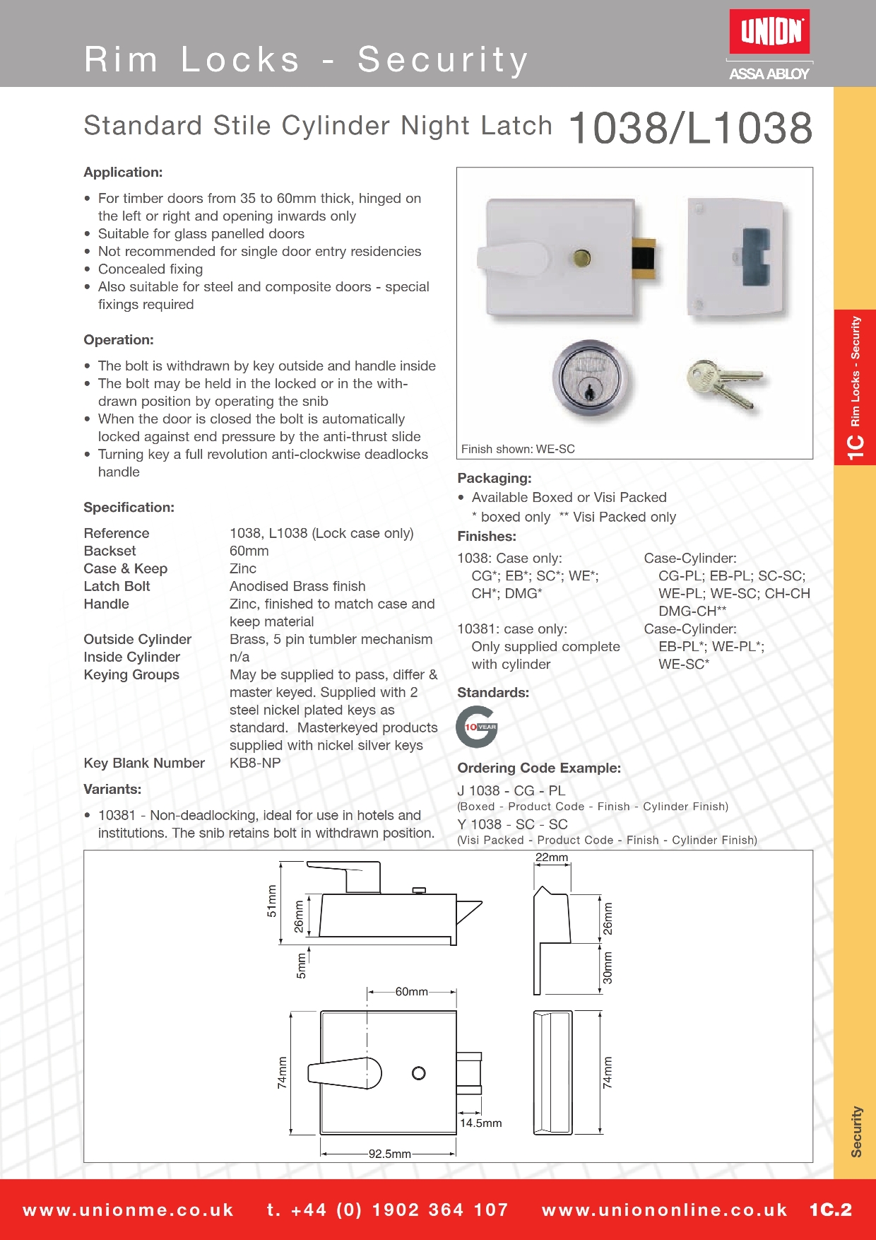 UNION Standard Stile Cylinder Night Latch 1038/L1038